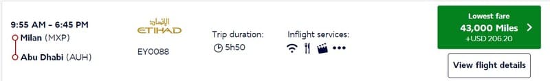 Verlegt man den Abflugort ins europäische Ausland findet man mitunter Verfügbarkeiten – wie hier für 43.000 Meilen von Mailand nach Abu Dhabi. Die Suche wird dadurch erschwert, dass man bei Flying Blue die Suchergebnisse in der Kalenderansicht nicht nach Airlines filtern kann. Man sieht also jeden Tag günstige Verfügbarkeiten, aber es fast nie Etihad.