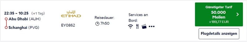 Doch es gibt sie auch – die Etihad Business Class Flüge, die ihr mit Flying Blue Meilen buchen könnt. Hier z.B. eine sehr günstige Verbindung von Abu Dhabi nach Shanghai für gerade mal 50.000 Meilen und Zuzahlungen von 190 Euro. Auch nach Indien, Sri Lanka oder Nordafrika sind mitunter Prämienverfügbarkeiten zu finden.