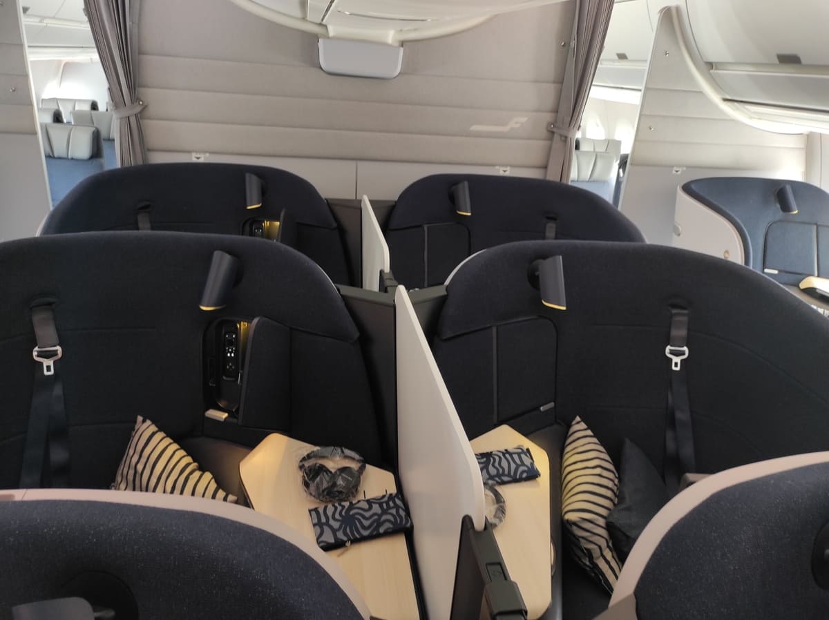 Finnair hat den neuen Airlounge Sitz im A350 in einer 1-2-1- Anordnung in zwei Business Class Kabinen verbaut. Die hintere Kabine ist mit nur drei Reihen etwas privater. Dahinter beginnt die Premium Economy, die allerdings auf der Strecke nach München nicht verkauft wird. Ob diese Sitze leer bleiben werden oder Statusinhaber dorthin upgegradet werden, werden wir erst im Sommer nächsten Jahres wissen.