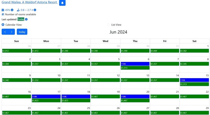 Darüber hinaus gibt es eine Reihe von Tools, die die Ergebnisse noch ein bisschen präziser darstellen. MaxMyPoint beispielsweise hat ebenfalls eine monatliche Kalenderübersicht, in der aber neben den Punktepreisen auch die Cash Rates mit angezeigt werden. Ihr könnt so auf einen Blick sehen, welchen Wert eure Punkte bei einer Buchung an einem spezifischen Tag erzielen würde. Klickt ihr auf einen konkreten Tag, werdet ihr direkt in die Suchergebnisse auf der Hilton- Webseite weitergeleitet, wo ihr die Buchung dann direkt durchführen könntet – vorausgesetzt, das Zimmer ist dort noch verfügbar. Außerdem wird euch eine prozentuale Verfügbarkeit für die nächsten 365 Tage angezeigt. Das gibt euch auf den ersten Blick einen guten Eindruck davon, wie leicht oder schwer es werden wird, Prämienverfügbarkeiten für eure Wunschdaten zu finden.