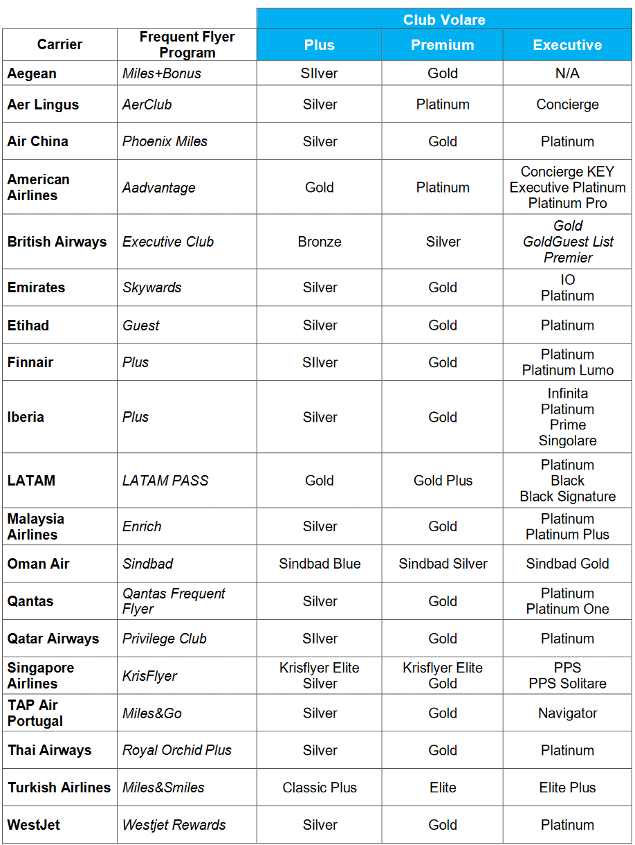 Der Volare Club Plus Status entspricht dem Skyteam Elite Status, der ein ähnliches Vorteilspaket enthält wie der Star Alliance Silber oder der Oneworld Ruby. Der Volare Club Premium entspricht dem beliebten Skyteam Elite Plus Status mit Loungezugang und Priority Vorteilen. Dieser Status ist vergleichbar mit Star Alliance Gold oder Oneworld Sapphire. Der Volare Club Executive Status ist schließlich der höchste Status des Programms, der beim Skyteam keine allianzweite Entsprechung hat.