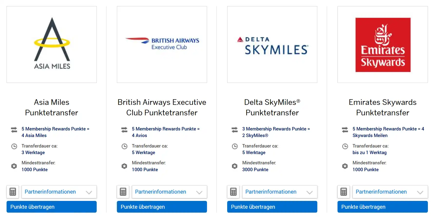 Um Membership Rewards Punkte übertragen zu können, benötigt ihr bei den jeweiligen Vielfliegerprogrammen ein Konto auf den exakt gleichen Namen. Das Konto ist bei allen Airlines kostenlos und schnell eingerichtet. Alle Programme erfordern eine Mindestzahl an Punkten, die ihr transferieren müsst und alle Programme haben auch eine individuelle Transferdauer.